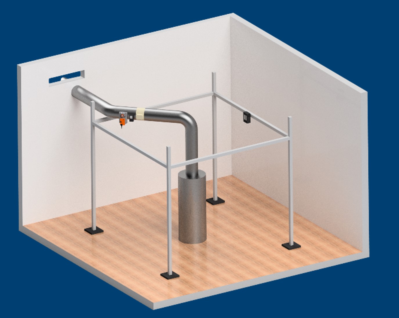 Genutzt wird ein Versuchsraum mit einem Quellluftauslass, dessen Zuluftvolumenstrom über eine Drosselklappe gesteuert werden kann. Im Raum befindet sich ein CO2-Sensor mit einer Regeleinheit, der die Drosselklappe ansteuert.