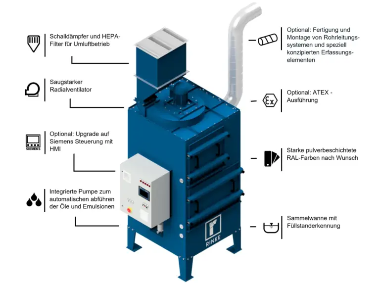 Um zu vermeiden, dass sich Schad- und Fremdstoffe in Fertigungshallen ausbreiten und beispielsweise als Ölfilm über Maschinen und Gebäudeteile legen, empfiehlt sich die Absaugung durch die Anlage direkt am Entstehungsort. Gerne legen wir den Aerosolabscheider individuell für Sie aus und fertigen passende Rohrleitungssysteme sowie leistungsstarke Erfassungselemente wie unsere Absaugwand.