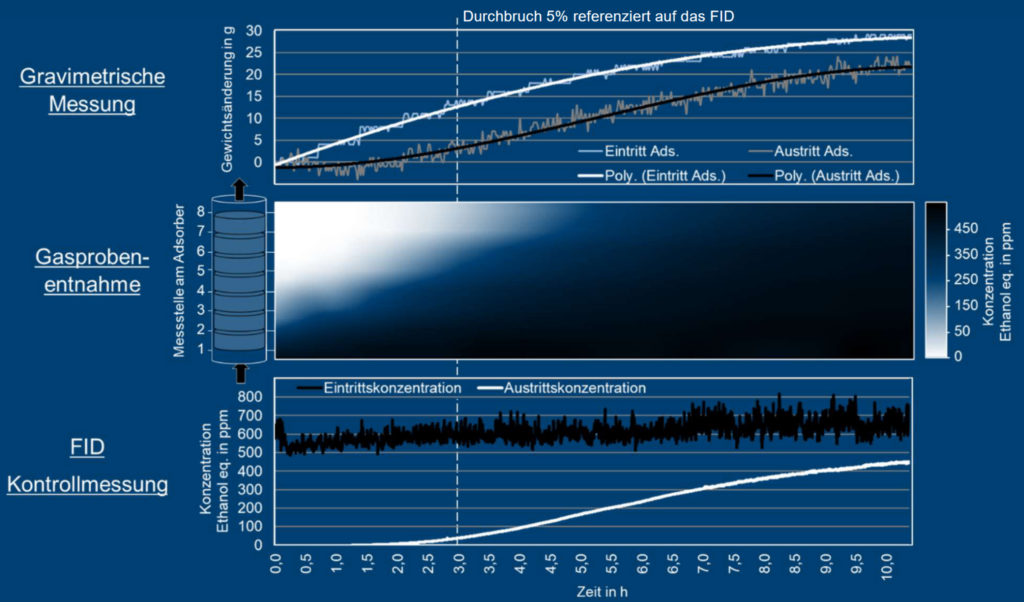 Die Verfahren werden an einem zylindrischen Festbettadsorber (Ø 100mm x 300mm) mit Ethanol als Schadstoff getestet. Als Referenz für die Messverfahren wird ein Flammenionisationsdetektor (FID) eingesetzt, der auf den Prüfstoff kalibriert ist und die Eintritts- und Austrittskonzentration des Absorbers überwacht.