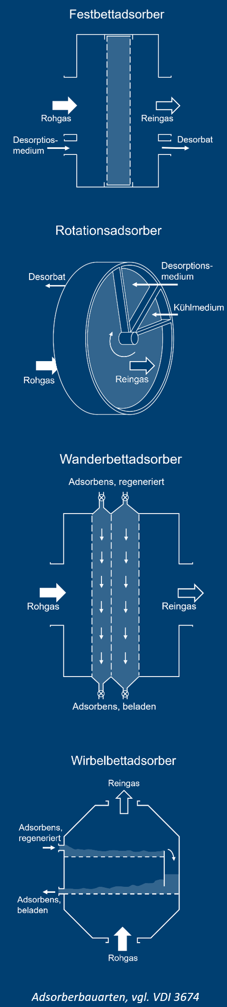 Wie zuvor erwähnt wird der Festbettadsorber am häufigsten eingesetzt. Die Gruppe der Festbettadsorber lässt sich hierbei noch weiter unterteilen. Ein breites Anwendungsspektrum findet der Wechselbettadsorber, in der das beladene Adsorbens durch ein frisches ausgetauscht wird. Das beladene Adsorbens kann regeneriert und neu verwendet oder technisch sauber entsorgt werden. Im Konzentrationsbereich zwischen 10 und 100 g/m³ werden nach Bathen häufig PSA-Festbettadsorber bei Volumenströmen bis 1.000 m³/h eingesetzt. PSA steht für pressure swing adosprtion und sorgt für eine Regeneration des Adsorbens, indem verschiedene Druckniveaus angefahren werden. Durch den Unterdruck löst sich das aufkonzentrierte Adsorbat und kann in eine Thermische Nachverbrennung oder Kondensationsanlage verarbeitet werden. TSA-Systeme (temperature swing adsorption) arbeiten mit unterschiedlichen Temperaturniveaus (mit möglichen Kombinationen der Oxidation (TSA-Ox) oder Wasserdampfregeneration), um das Adsorbens zu regenerieren. Dazu wird meist Wasserdampf in den beladenen Adsorber geleitet. Dies dient der Energiezufuhr, um die bestehenden Verbindungen aufzuspalten. Bei der Wasserdampfdesorption kann das Adsorbat im Wasser gelöst und über eine Destillation getrennt werden, was für die Rückgewinnung der Lösemittel genutzt wird. CSA-Systeme (concentration swing adsorption) durchströmen das beladene Festbett mit einem Volumenstrom, der eine geringere Konzentration aufweist, um eine Regeneration über das Gleichgewicht zu erhalten. Dieser Prozess benötigt viel Zeit, weswegen er in der Praxis kaum Anwendung findet. Aktuell wird an weiteren Desorptionsverfahren geforscht, wie beispielsweise das elektrothermische Verfahren (electric-swing-adsorption), was in Stahlwerken zum Einsatz kommen kann.